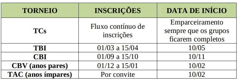 Obs: Excepcionalmente para o ano de 2025, devido à proximidade de datas, a TBI realizará inscrições entre 10.mar e 25.abr